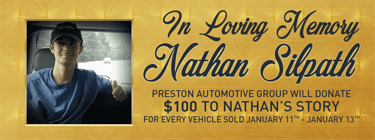Nathan’s good work helped many people from all walks of life and brought hope wherever he went. We at Preston Automotive Group wanted to do what we can to honor and celebrate his life. That is why we will be donating $100 to Nathan’s Story for every car that is sold at our dealerships from Thursday, Jan. 11 to Saturday, Jan. 13. This is an organization that the Silpath family started to document how Nathan handled his journey with cancer and to inspire others who are similarly affected by this terrible illness through fundraisers and more. According to its Facebook page, one mission of Nathan’s Story is to “see the good that can come from people coming together to fight this terrible disease.” We encourage all of our customers and everyone in the community to come out to one of our locations or visit the organization’s Facebook page, to find out what you can do to help this organization. Our thoughts and prayers are with the Slipath family and we thank Nathan for inspiring us all to live life to the fullest.