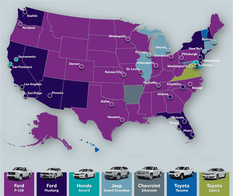 Second on that list was another Ford; one that was being redesigned in its 50th year of existence. If you haven’t guessed by know, the car we’re referring to is the Ford Mustang. This historically significant sports car came up as the 2nd most searched for vehicle on Cars.com. So, by state, the Mustang (dark purple) was searched most in 10 out of 50. If you combine the F-150 and Mustang, you see that Ford dominated the search results – owning 40 out of 50 states! This year’s Mustang was made with an independent rear suspension and sports a new, fastback look. We’ve sold several 2015 Mustangs at Preston Ford since they’ve been out in late October, and we still have several more on the ground with Convertible Mustangs on the way!