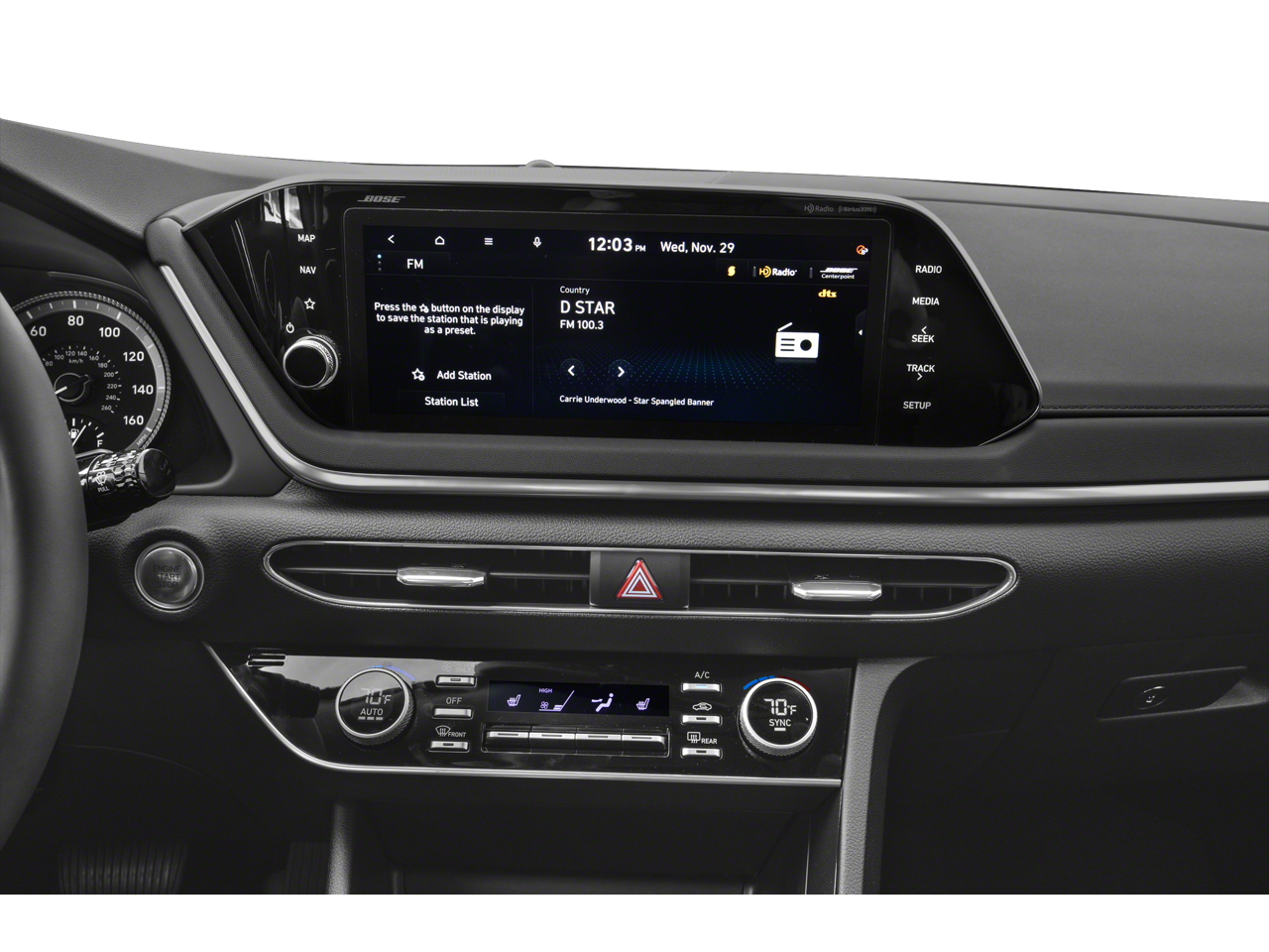 - Radio: AM/FM/SiriusXM/MP3 w/Navigation -inc: 10.25" color touchscreen, HD Radio, Blue Link, smartphone integration w/Apple CarPlay and Android Auto, Bluetooth® hands-free phone steering audio controls, Bose premium audio w/12 speakers (1 center channel, 2 dash, 2 front tweeter, 4 door mounted, 2 rear mounted speakers + 1 rear mounted subwoofer), dynamic voice recognition and HERE TD traffic
